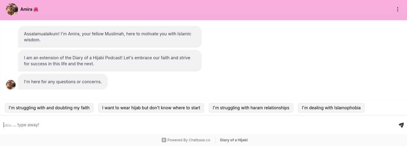 Robot conversationnel alimenté par l’IA qui offre aux femmes musulmanes un soutien 24/7 sur des sujets liés à la foi, à l’identité, à l’islamophobie et à la santé mentale.