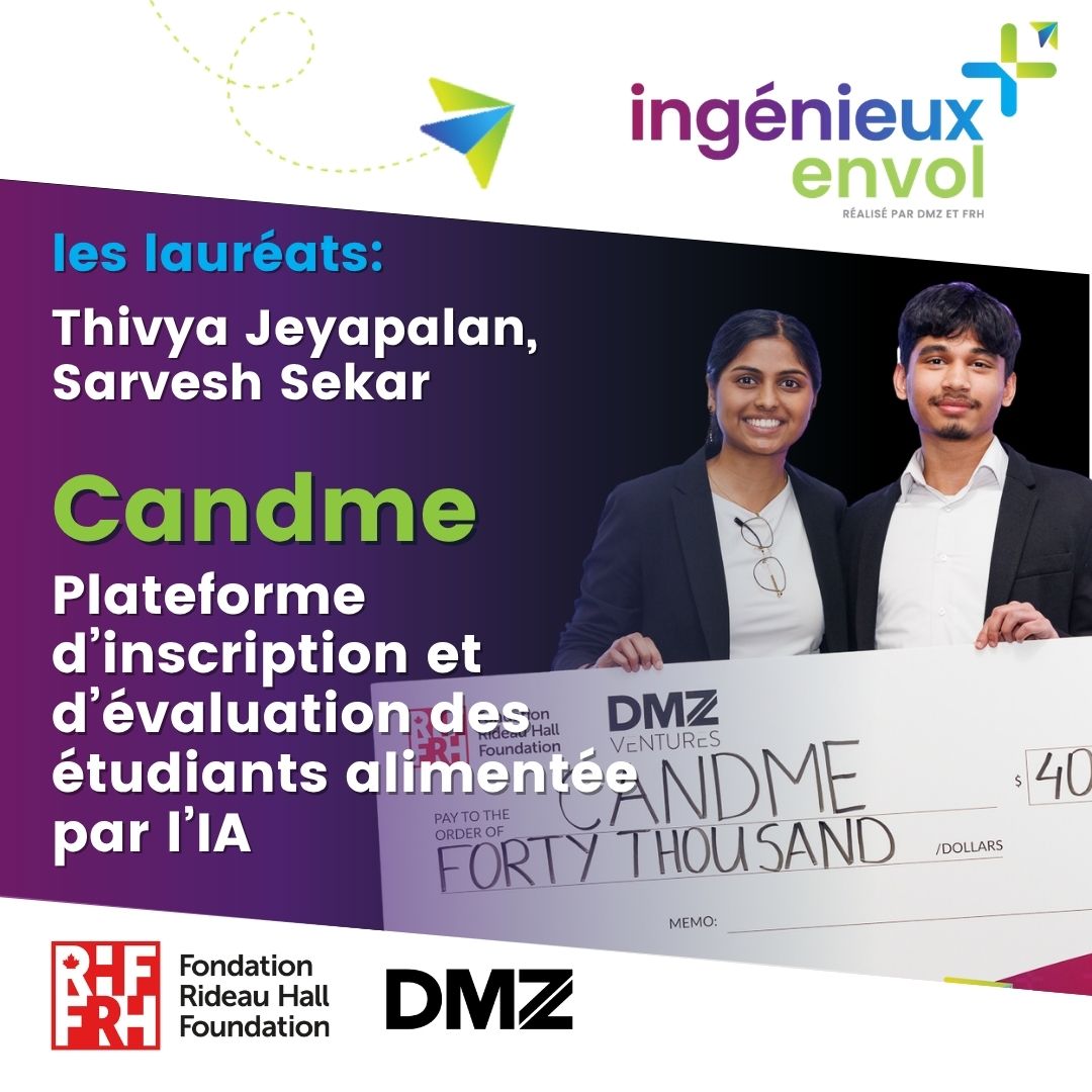 Ingénieux+ Envol, un partenariat entre la Fondation Rideau Hall et DMZ, a pour objectif d’aider la jeunesse innovatrice à transformer ses idées en entreprise. Les jeunes qui y participent bénéficient d’une formation, d’un mentorat et de la possibilité de solliciter des investissements pour donner vie à leurs projets.