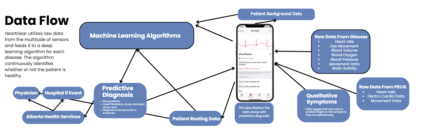HeartHear est un système compact composé d’électrodes (placées sur la tête et le thorax) et d’un électrocardiographe qui se sert de l’apprentissage automatique pour surveiller les signes vitaux et détecter les signes précoces d’un événement cardiaque.
